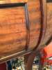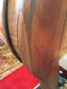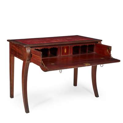 the rectangular top with a reeded edge inset with red leather skiver, above a long convex fitted frieze drawer, with a central inlaid cupboard, flanked by book end secret drawers, and pigeon holes, raised on tall reeded sabre legs