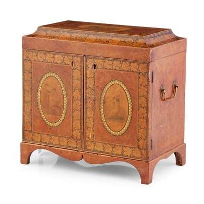 the hinged top decorated with a scene of a mother and child enclosed by floral penwork borders, opening to a compartmented interior, above a pair of doors with further images of mothers and children, opening to an arrangement of drawers, raised on bracket feet