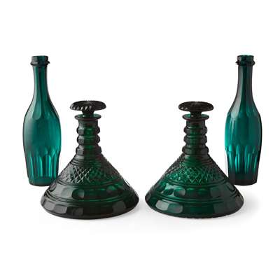 PAIR OF REGENCY GREEN GLASS SHIP'S DECANTERS