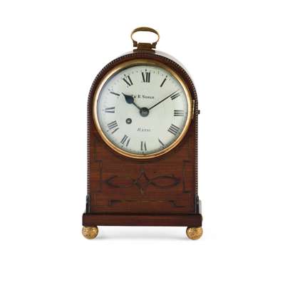 the circular enamel dial with Roman numeral chapter and one winding hole, with maker's signature, in an arched case with a brass handle and outlined with bead moulding and brass line inlay, raised on gilt metal ball feet embossed with flowers, with a single train non-striking movement