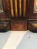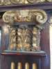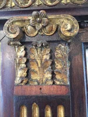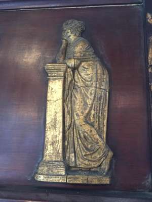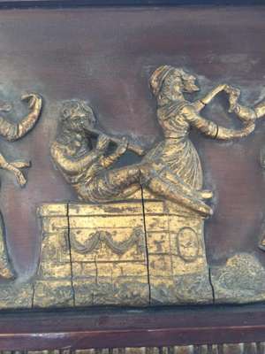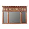 the moulded cornice with ball mounts above a divided frieze with figures of muses and dancing nymphs, above three bevelled mirror plates divided by fluted pilasters