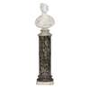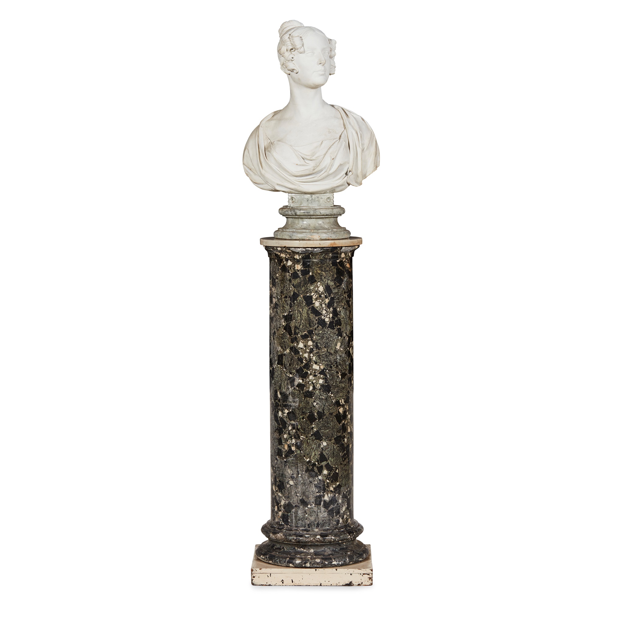 the subject with her hair in a chignon with ringlets, on a grey faux marble socle, unsigned; TOGETHER WITH a grey scagliola column