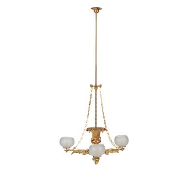 the central stem a with three chain suspension, linked on scrolled arm supports to the central flaming twin handled urn, the three branches with drip pans and opaque globular glass bulbs