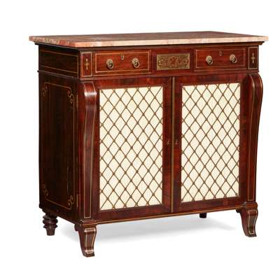 REGENCY ROSEWOOD, GRAIN PAINTED AND BRASS INLAID PARCEL GILT SIDE CABINET Y