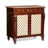 the rectangular pink marble top above three frieze drawers, the centre drawer with a brass inlaid panel, over a pair of doors with brass grilles backed by yellow silk opening to an adjustable shelf, on short cabriole forelegs and turned rear legs