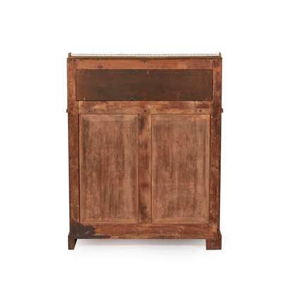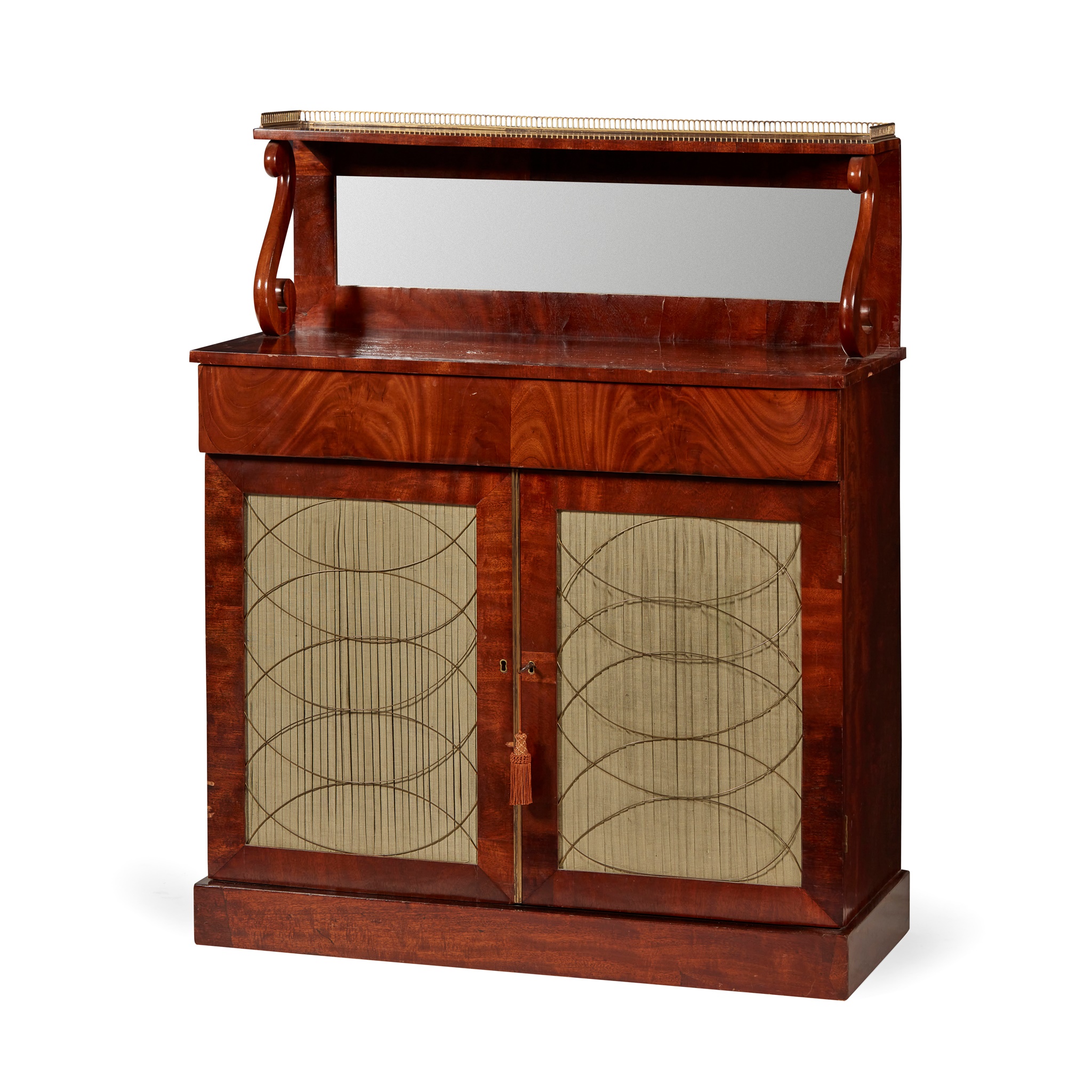 the raised back panel and brass three-quarter gallery on lyre supports and mirror back, above a frieze drawer and a pair of pleated doors with interlaced brass wire, enclosing a shelf, on a plinth base