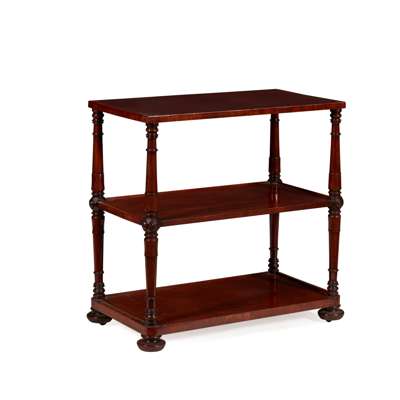 the rectangular crossbanded top on turned supports with two shelves below, raised on turned feet with recessed brass castors