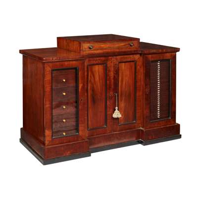 the inverted breakfront top surmounted by a rectangular brass-banded plinth inlaid with a drawer, above twin recessed panelled doors enclosing shelves, flanked by glazed doors enclosing six drawers to one side and thirty-four shallow drawers fitted with red baize inserts for coins to the other, all with turned ivory handles, raised on a conforming plinth with an ebonised base