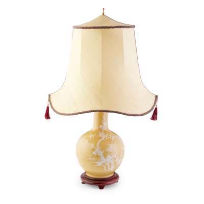 decorated with white slip with flowering branches and birds, drilled and converted to a lamp, with a yellow silk pagoda shade