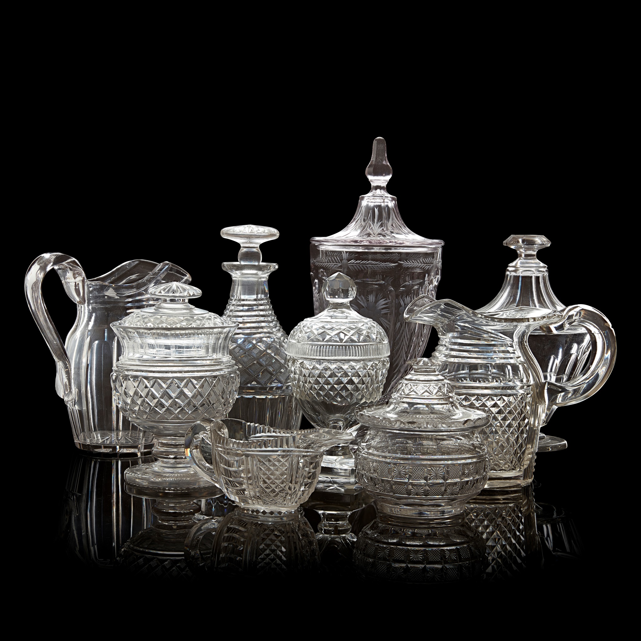 comprising two water jugs, a small sauce boat, five various jars with covers, and a decanter with stopper, the body with a band of strawberry cut diamonds