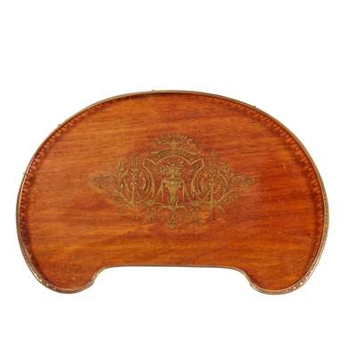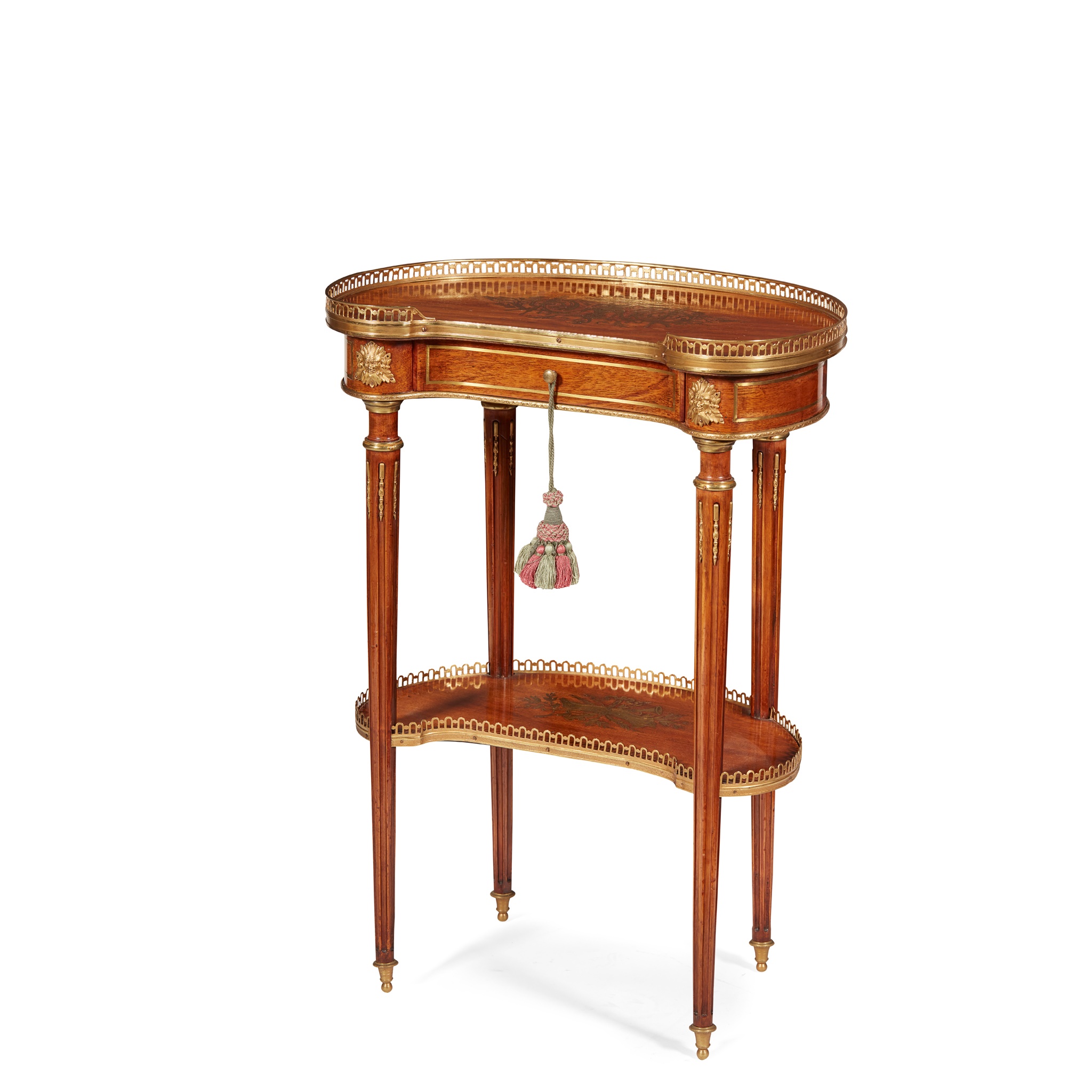 the kidney-shaped top with a pierced brass three-quarter gallery enclosing a top inlaid with a brass vase and scroll motifs, above a frieze drawer, on fluted tapering legs joined by a conforming undertier and ending in brass feet, bearing a brass plaque