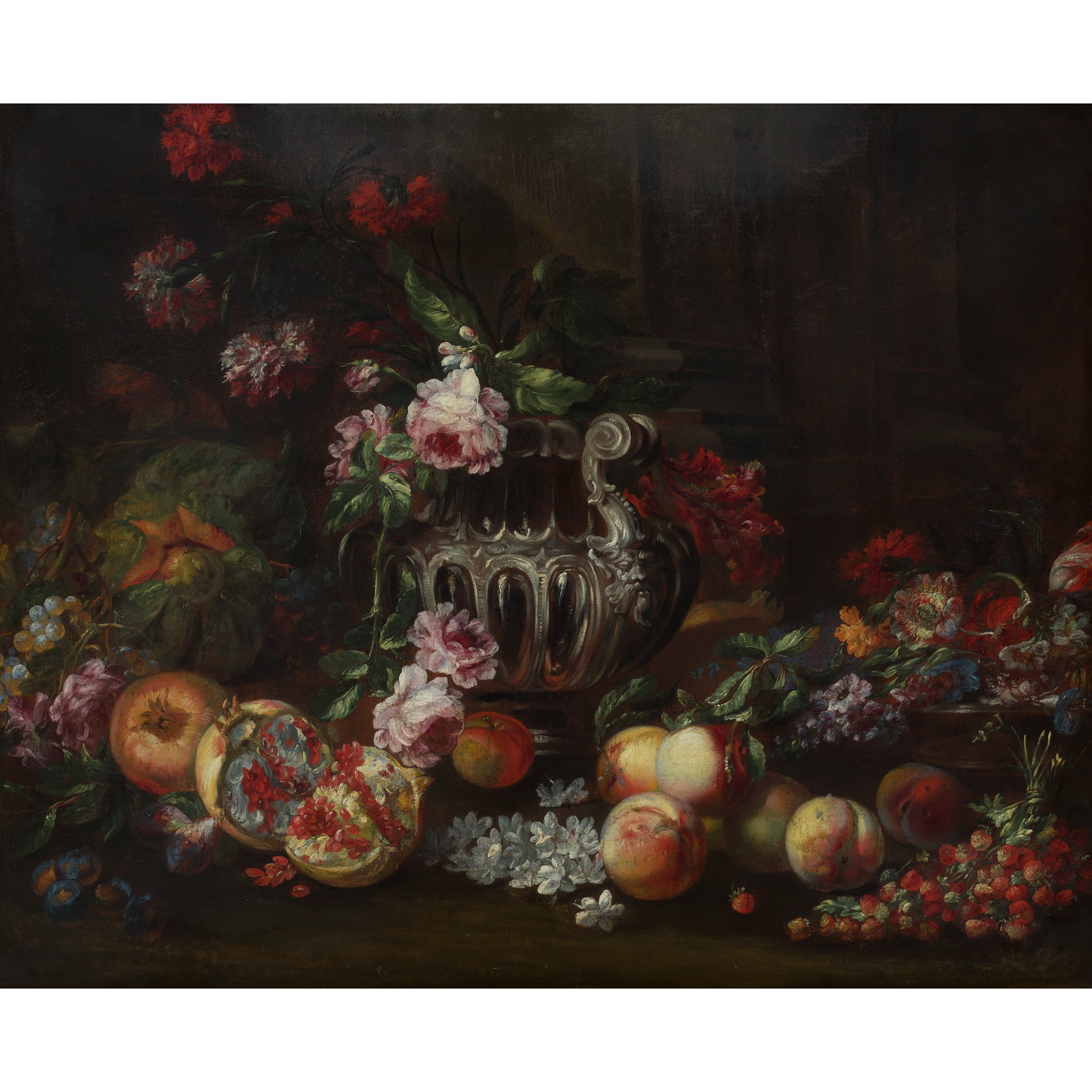A STILL LIFE OF ASSORTED FRUIT AND FLOWERS WITH SILVER URN