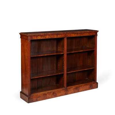 the moulded cornice above a plain frieze, and two open compartments with adjustable shelves, on a plinth base