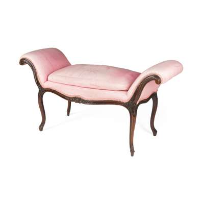in the French style, the outscrolled padded arms flanking a loose cushion seat, raised on moulded cabriole legs; in distressed pink silk