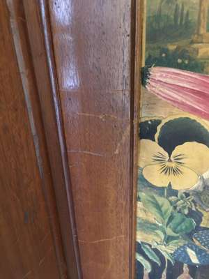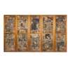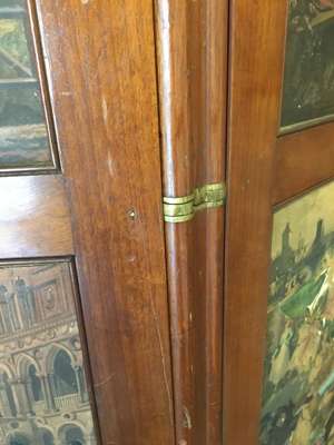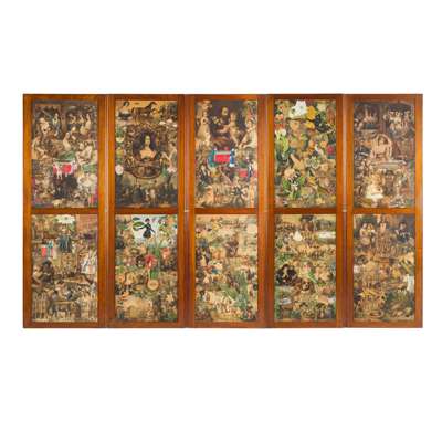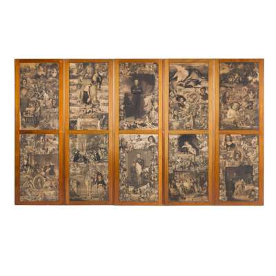 each panel with various coloured printed scenes of historical figures, flowers, animals and old master and genre paintings; the reverse similarly decorated with black and white prints