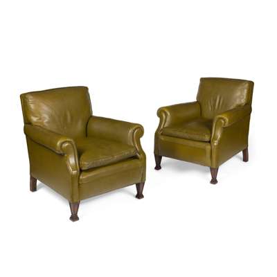 the square backs above loose cushion seats and scrolled arms, covered in pea-green leather, raised on moulded square tapered legs