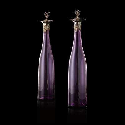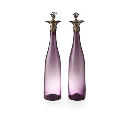 PAIR OF EARLY VICTORIAN SILVER MOUNTED AMETHYST GLASS WINE BOTTLES