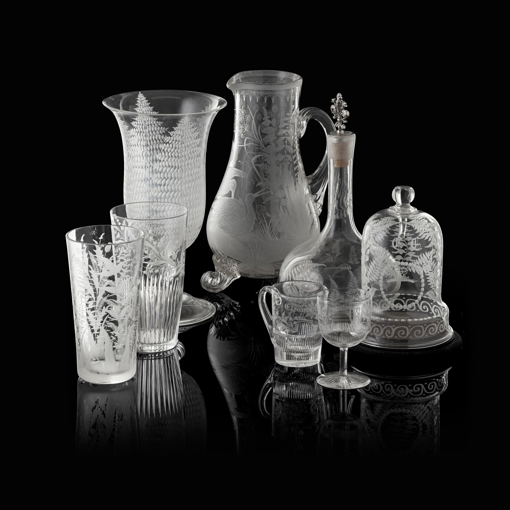 comprising a tall tumbler and smaller glass with handle, both cut with flutes, both engraved with sprays of flowers, the tumbler inscribed 'William 18.5cm high Frain 1878', the smaller inscribed 'Eleanor Lockhart Frain Born 6th June 1890'; a tall jug on three scroll feet, etched with two birds amongst foliage, 26.5cm high; a shaft and globe decanter, a tall tumbler and a vase with a flared rim on a knopped stem, 25.5cm high, all engraved with ferns; a small sherry glass cut with flutes, engraved with the monogram 'W F' and dated '24th August 1892'; and a pocket watch display dome on later wooden stand, engraved with ferns and scrolls, with inscribed initials 'G C' , with a glass hook for suspending a watch