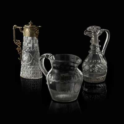 one with a central band of strawberry cut designs in the form of circles, petals and navettes, the neck with three faceted rings, with a star cut mushroom stopper and star cut base, the handle with a cut thumb rest, 27cm high, the other of flattened oval form, with decoration in the Aesthetic taste, the central band cut with a roundel to each side engraved with flowers and foliage, between multiple bands of geometric designs, with engraved white metal mounts, 29cm high; TOGETHER WITH a large water jug, possibly Irish, the lower body with flute cutting, a circular medallion below the spout engraved 'J A H May 5 1816', with prunties at the shoulder and a band of stylised cut leaves to the neck, with a strap handle
