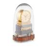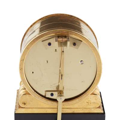 the drum case with a gilt metal engine turned dial with Roman numerals and a single winding hole, on a rectangular black marble plinth mounted with fruit garlands, signed on the backplate 'Viner/ New Bond St. London', on a rosewood base with glass dome