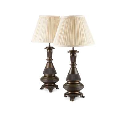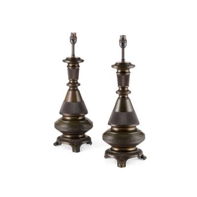 PAIR OF PATINATED METAL AESTHETIC MOVEMENT MODERATOR LAMPS