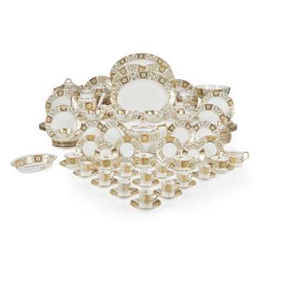 decorated with green enamel and gilt floral designs in alternating panels, pattern A1237, red printed factory marks, comprising: twelve teacups and twelve saucers (14.5cm diam), twelve coffee cans and twelve saucers (12cm diam), twelve side plates (16cm diam), twelve twin handled soup bowls and twelve stands (16cm diam), twelve salad plates (21.5cm diam), twelve dinner plates (27cmm diam),two cream jugs (9.5cm and 115.cm high), a twin handled sugar bowl, a round sugar bowl (10cm diam), a teapot, a coffeepot, two twin handled tureens with covers, a sauce boat on stand, a large round bowl (24cm diam), two oval serving ashets (38cm long and 41cm long), and an oval serving dish