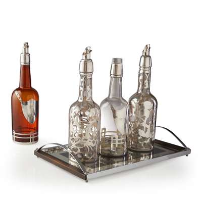 comprising two glass decanters with mallet shaped bodies and pourers with cork stops, with foliate silver metal overlay, 32cm high; a brown glass decanter with silver metal overlay in the shape of a shield on a chain, stamped MEME SWEDEN, 34cm high; and another glass decanter with a mallet shaped body and silver metal overlay, bearing a SCOTCH label, 28.5cm high; TOGETHER WITH a rectangular chrome and wood tray, stamped REGENT OF LONDON