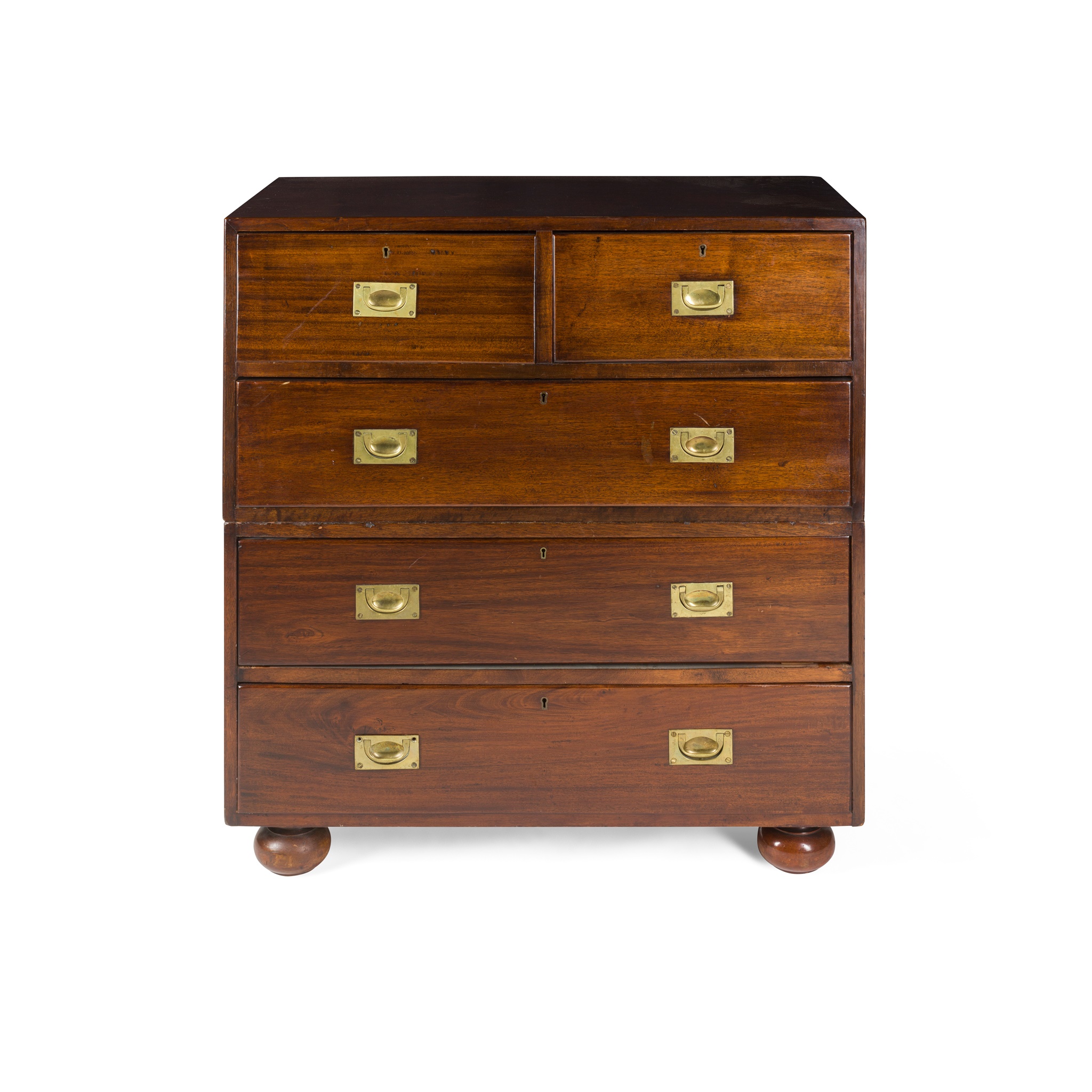 in two sections, the top with two short and one long drawer, the base with two further long drawers, with inset brass handles, raised on bun feet