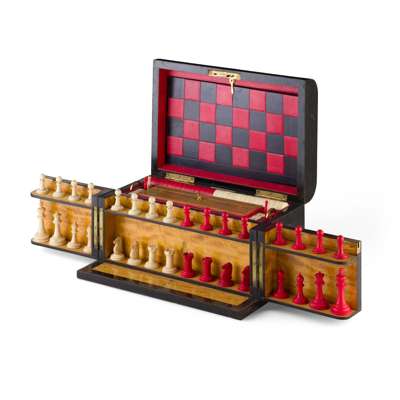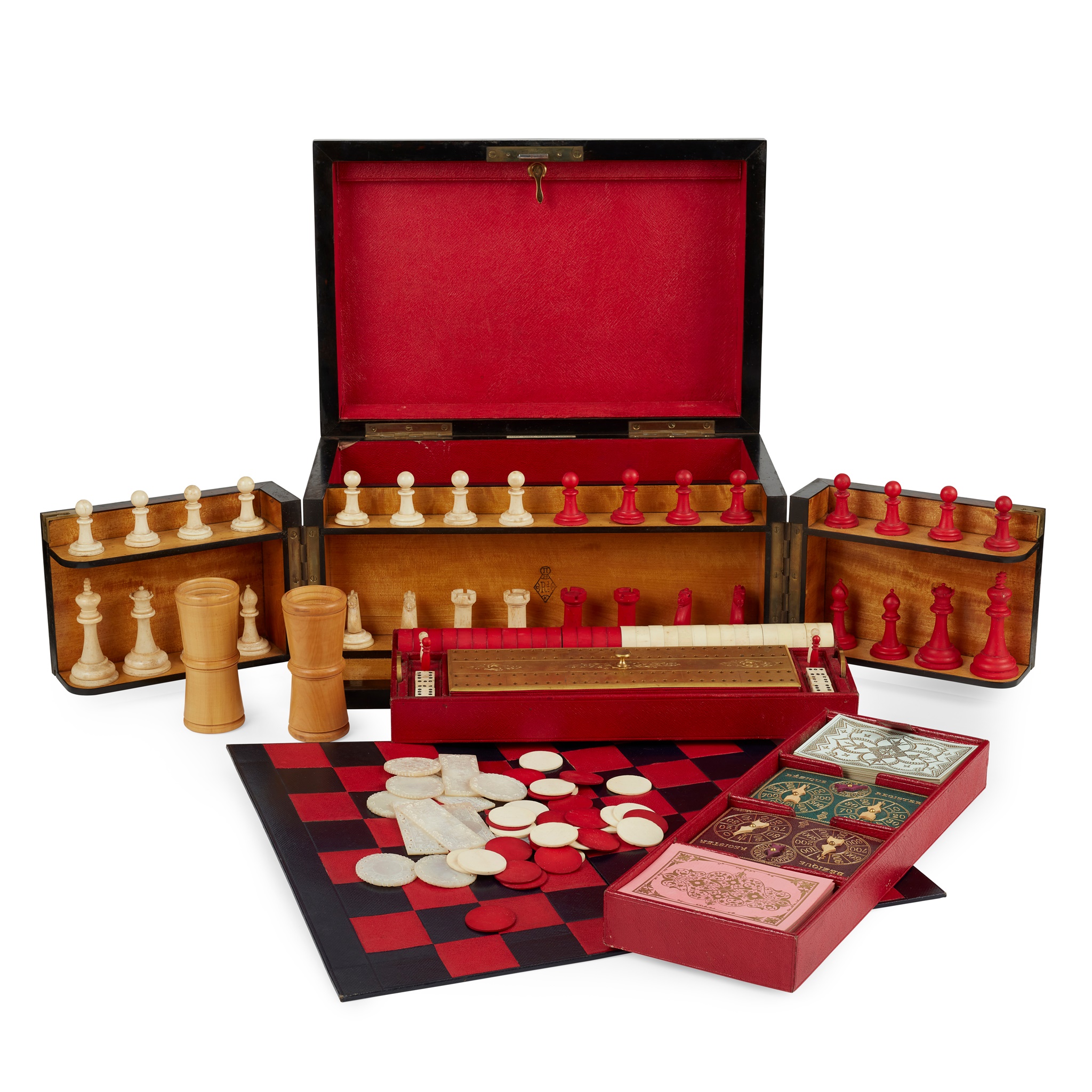 the hinged lid inset with a brass oval inscribed 'F. Fraser', opening to reveal a red leather lined interior with folding games board, fitted with a gilt cribbage board and turned bone draughts and whist markers, the two hinged doors to the front opening to reveal a satinwood lined interior, bearing a registration mark, and with ivory chess pieces, the interior with tray inserts containing other games related items, the box bearing a ivory maker's label