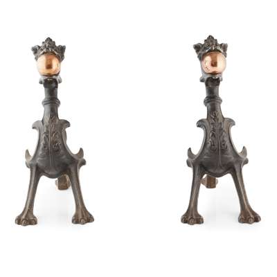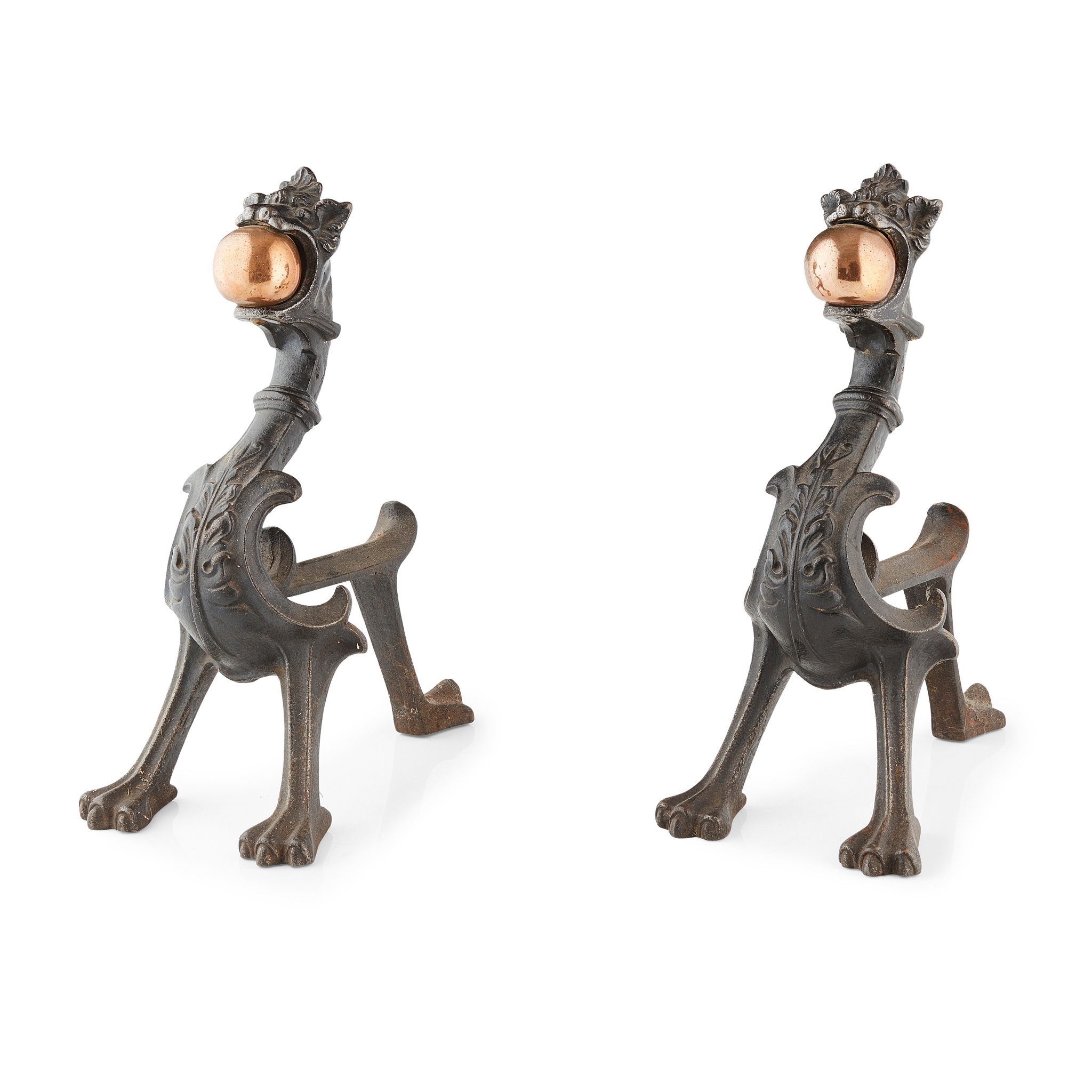 PAIR OF CAST IRON AND COPPER FIREDOGS