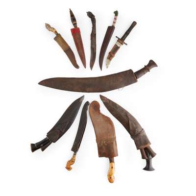 a curved single edge blade with the hilt inlays of mother-of-pearl in plain replacement sheath; a knife with grip with carved dragon head pommel; another with carved ebony and pierced decorations (Kandy Knife ) with damaged scabbard; an oval grip knife in leather sheath; a short European Bowie type knife; an ivory and silver hilted knife; and a cleaver with ivory grips and wooden sheath, Indian dagger (peshkabz); TOGETHER WITH three Nepalese Gurkha Kukri fighting knives with buffalo horn and wooden grips and companion knives WITH A CLEAVER WITH IVORY GRIPS AND WOODEN SHEATH INDIAN DAGGER (PESHKABZ)