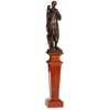 composition, with a dark brown surface to simulate bronze, on a stained wood tapered square pedestal