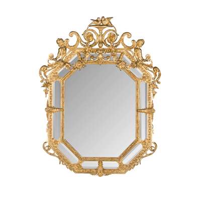 the bevelled octagonal plate within margin plates surmounted by foliate scrolls, putti heads, flower garlands, and a central pair of lovebirds