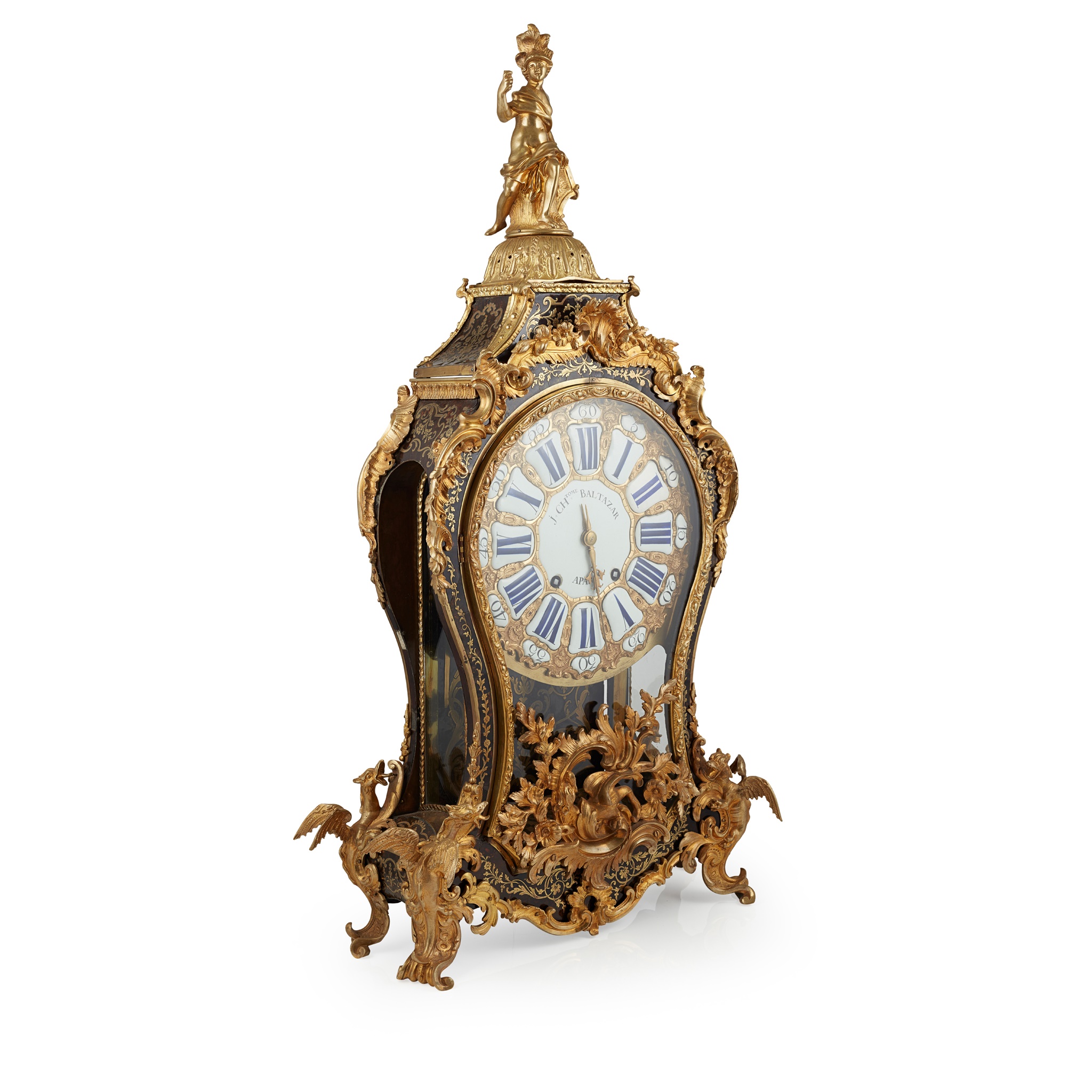 the waisted rococo case set with individual blue and white Roman numeral chapters and black and white seconds chapters, signed J*C H TOME BALTAZAR/ A PARIS, the case with gilt bronze dragons and surmounted by the figure of Minerva, the backplate engraved J C me v Baltazar A Paris, the eight-day twin barrel movement chiming on a bell