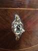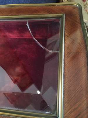 the hinged brass-banded top with a bevelled glass panel opening to a red plush lined interior, raised on slender square cabriole legs with gilt metal mounts