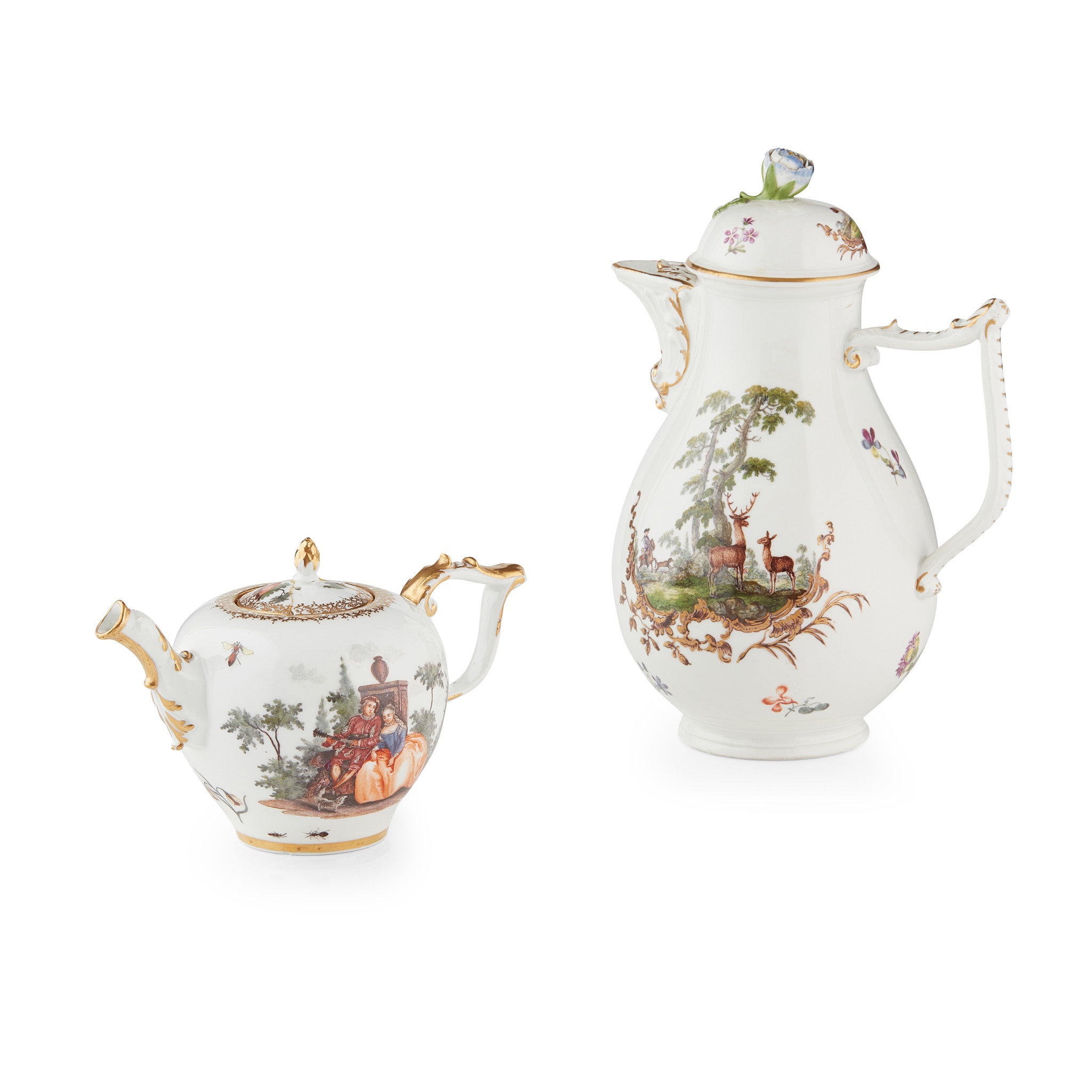 of pear shape, the domed cover with a flower finial, with scroll moulded spout and tau handle, the body painted to both sides with huntsmen and their dogs pursuing stags and deer in the landscape, blue underglaze crossed swords mark, 23.5cm high, TOGETHER WITH a Meissen teapot painted to both sides with a courting couple in a landscape setting, with insects and flower sprigs, with a bird's head moulded spout and tau handle, blue underglaze crossed swords and gold painted S