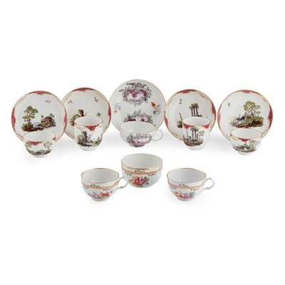 comprising four Höchst cups and saucers, painted with waterside scenes within puce and gilt floral borders, including two coffee cups with wishbone handles and two teacups, blue underglaze wheel mark, saucers 13cm diameter; a Fürstenberg cup and saucer each painted with two panels in puce monochrome depicting buildings in a landscape setting, within a scrollwork cartouche border, with floral sprays and gilt rim border; blue underglaze F mark, saucer 14cm diameter; and two further Fürstenberg tea cups with a matching sugar bowl, painted with floral decoration and gilt rim borders, blue underglaze F marks,