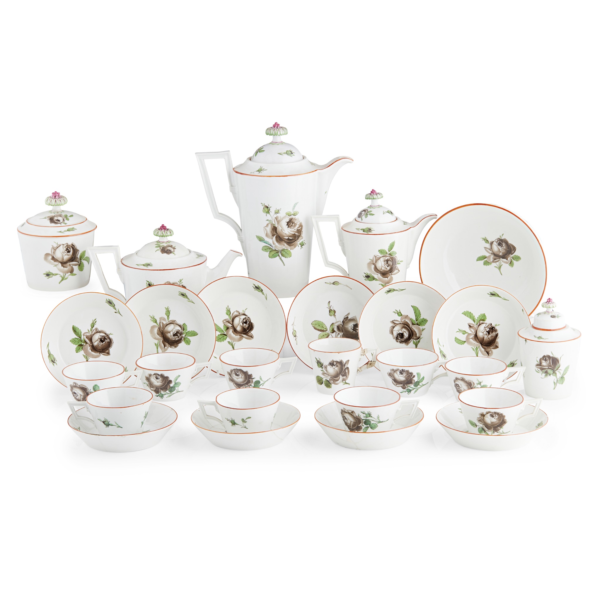 the pieces formed with angular square section handles, the cups and pots of tapering cylindrical form, painted throughout with grey roses and buds on leafy green stems, comprising: a coffee pot, a hot water pot, a tea pot, a caddy with cover, a sugar basin with cover, a slop bowl, nine tea cups, one coffee cup, five saucers; blue underglaze Marcolini marks