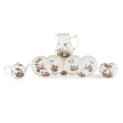 painted with scenes of courting couples in a landscape setting, comprising a teapot with moulded bird's head spout and tau handle, a coffee pot with tau handle (cover lacking), three tea cups, four saucers, and a leaf shaped dish with domed cover, blue underglaze crossed swords marks and painted gilt marks