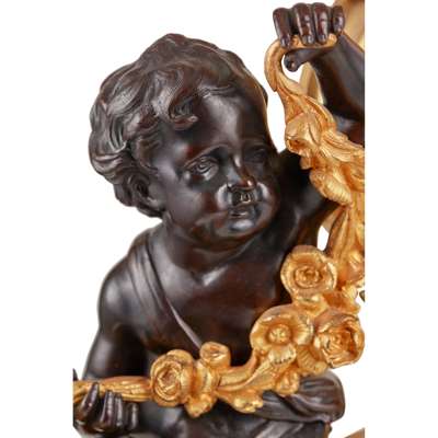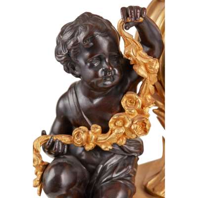 the circular white enamel dial with Roman and Arabic chapters and twin winding holes, in a cylinder case surmounted by an urn with pinecone finial, flanked by seated putti holding flower garlands, on a shaped rectangular base with a shell motif and raised on scroll feet, the eight-day movement striking a bell