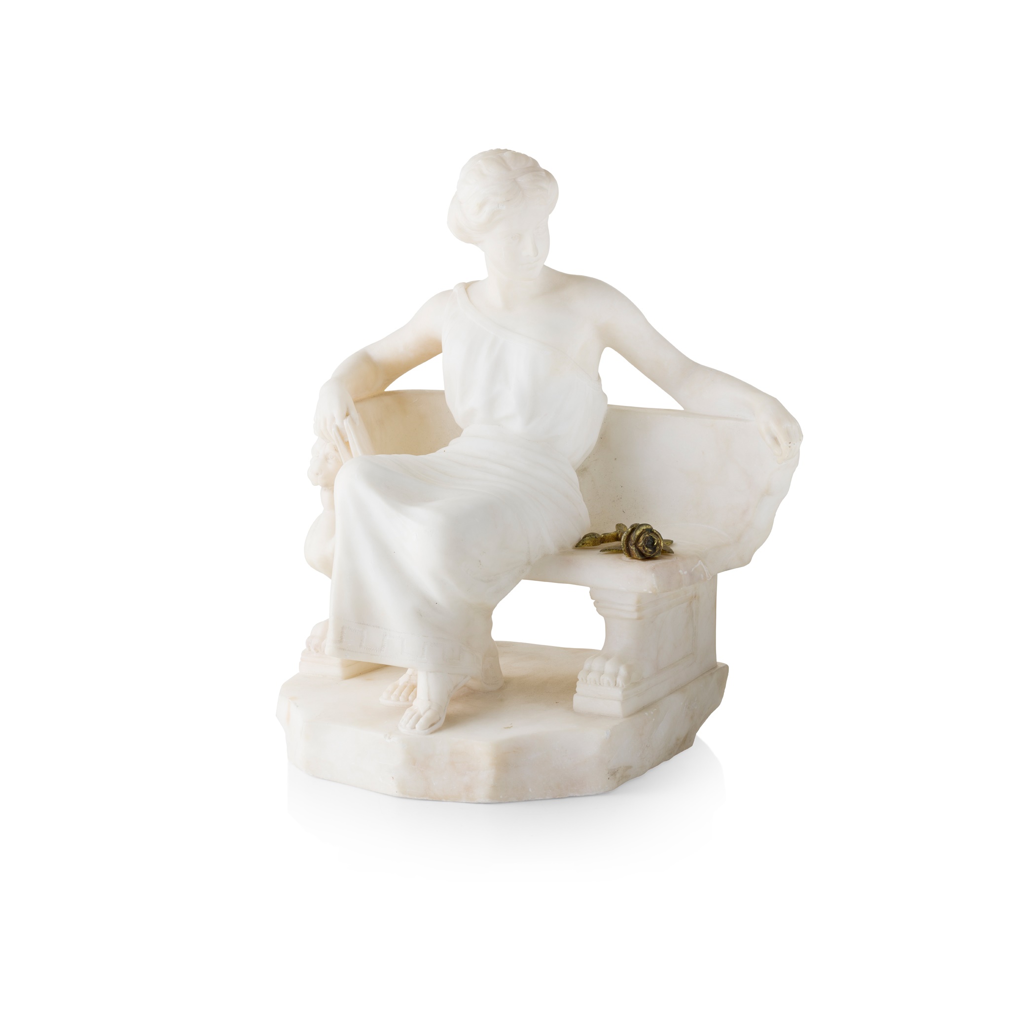 the figure seated on a bench holding a book and regarding a gilt bronze rose resting beside her on the seat, signed NICCIOLE