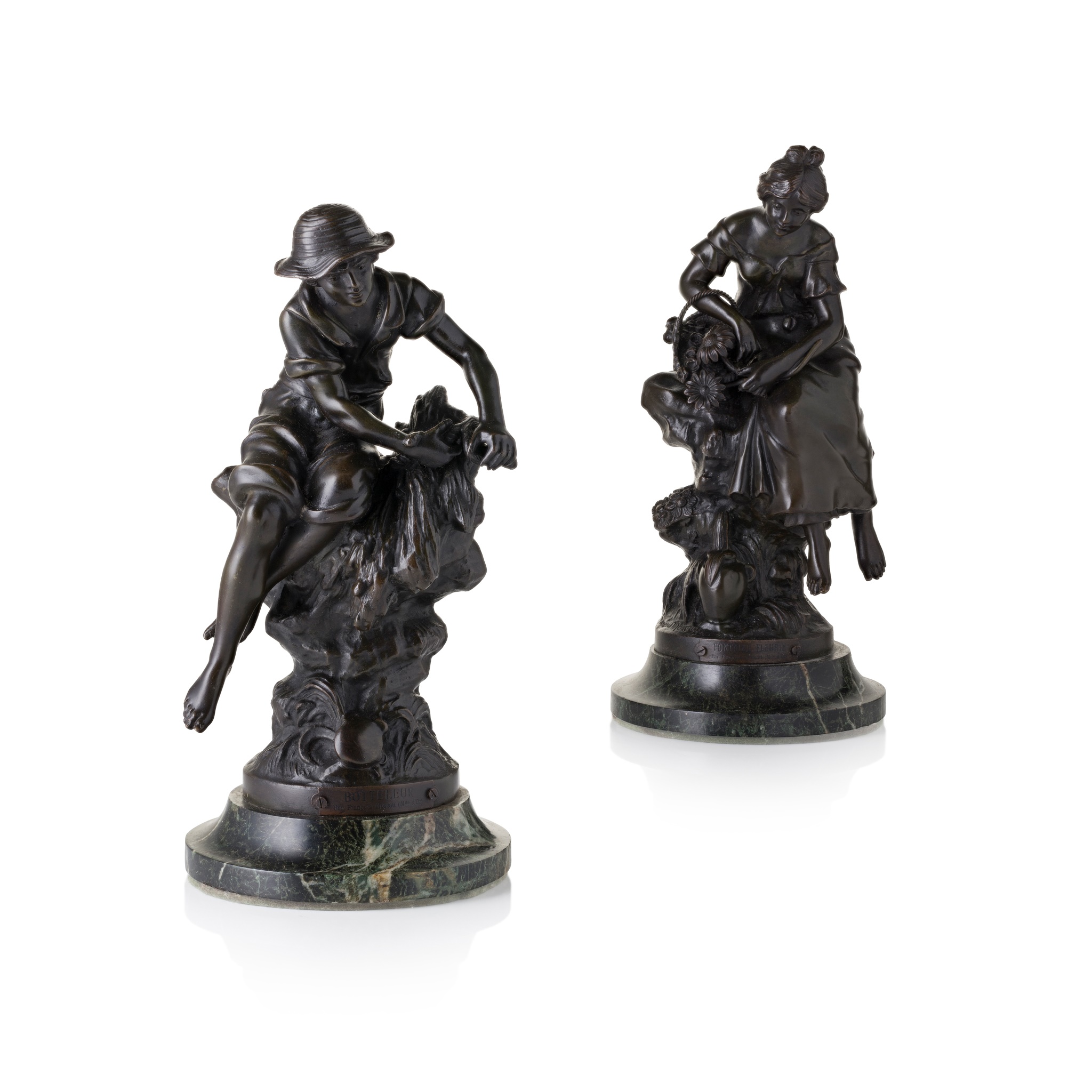 bronze, dark brown patina, signed, on circular green marble bases