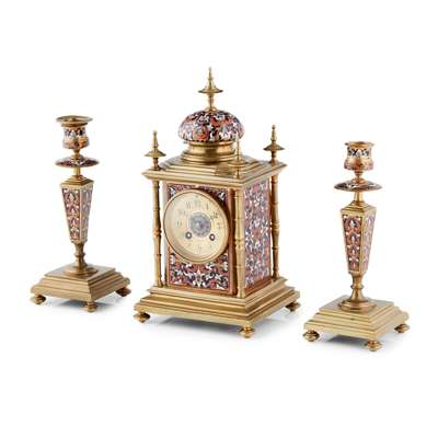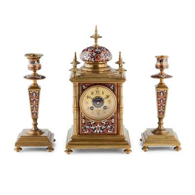 FRENCH CHAMPLEVÉ ENAMEL AND GILT BRASS THREE PIECE CLOCK GARNITURE