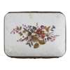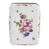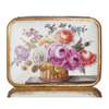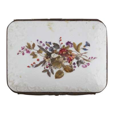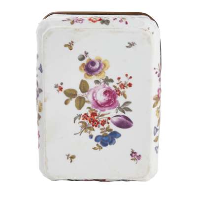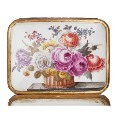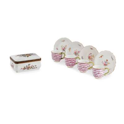 the outside of each cup moulded with overlapping petals shaded in pink, the handle in the form of a green leafy branch, painted to the interior with a bouquet and sprigs of flowers, the underside of each saucer also with moulded overlapping petals, the upper surface painted with flowers; unmarked saucers 14cm diameter, cups 6.5cm high, TOGETHER WITH a Continental porcelain gilt metal mounted basket and scroll moulded box, painted to the sides, lid, interior and underside with flowers; unmarked