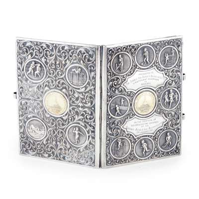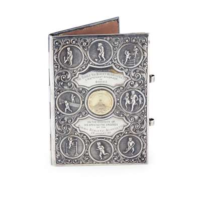 of rectangular form, the front and back with chased and embossed scrolling decoration and with twelve roundels with relief moulded figures representing cricket, football, hurdles, running, hockey, rugby, high jump, tennis, boxing, pole vaulting, shot put, and swimming; the front and back cover set to the centre with a gilt medallion with the moulded inscription 'Burma Athletic Association', and centred with a temple, the front inscribed 'Presented to The Honble Sir Harvey Adamson K.C.S.I Lieutenant Governor of Burma On the Occasion of his Opening the Grounds of the Burma Athletic Association, 2nd January 1911', fitted with a pen holder