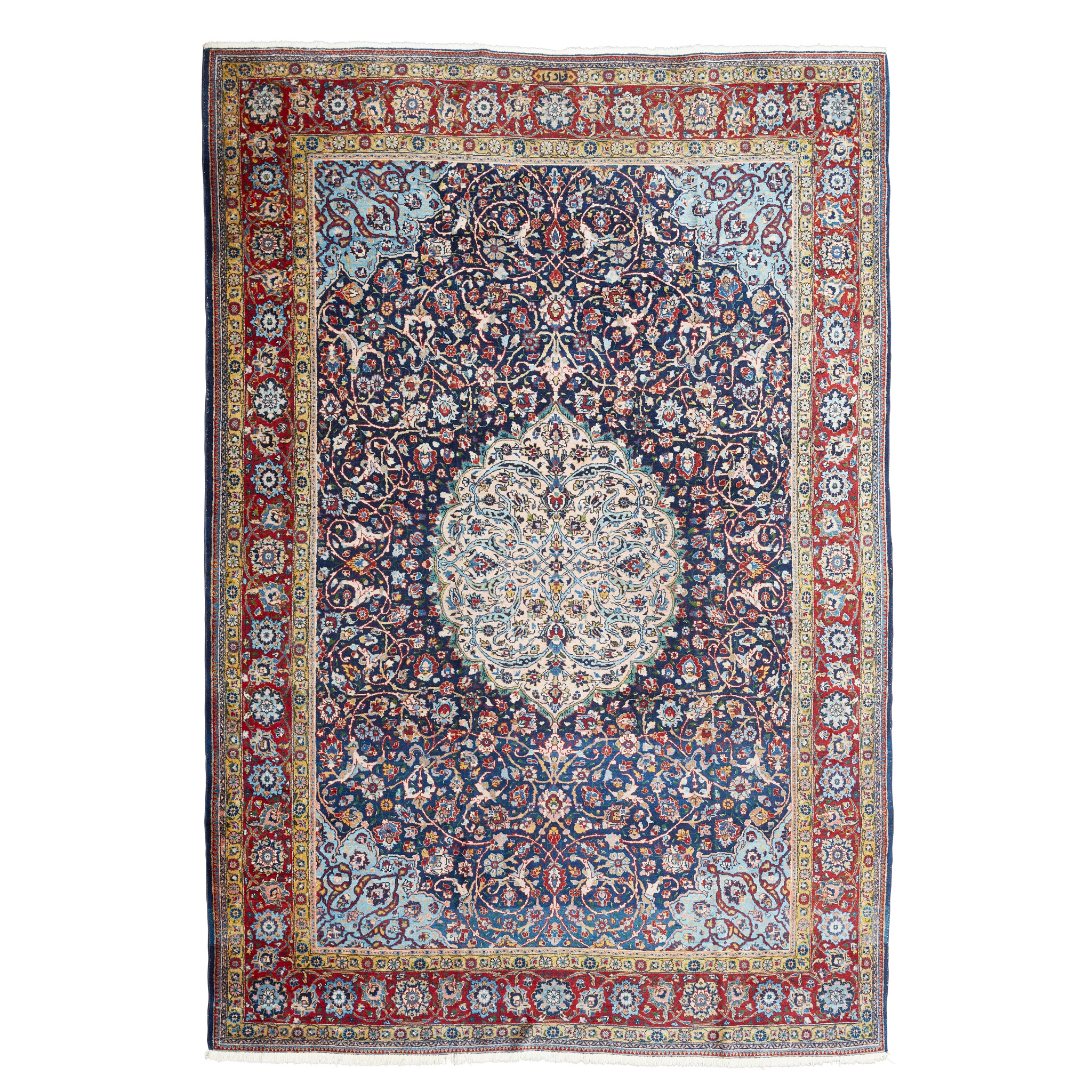 the indigo field with camel medallion, light blue spandrels, within dark red rosette, palmette and vine border, signed to one end