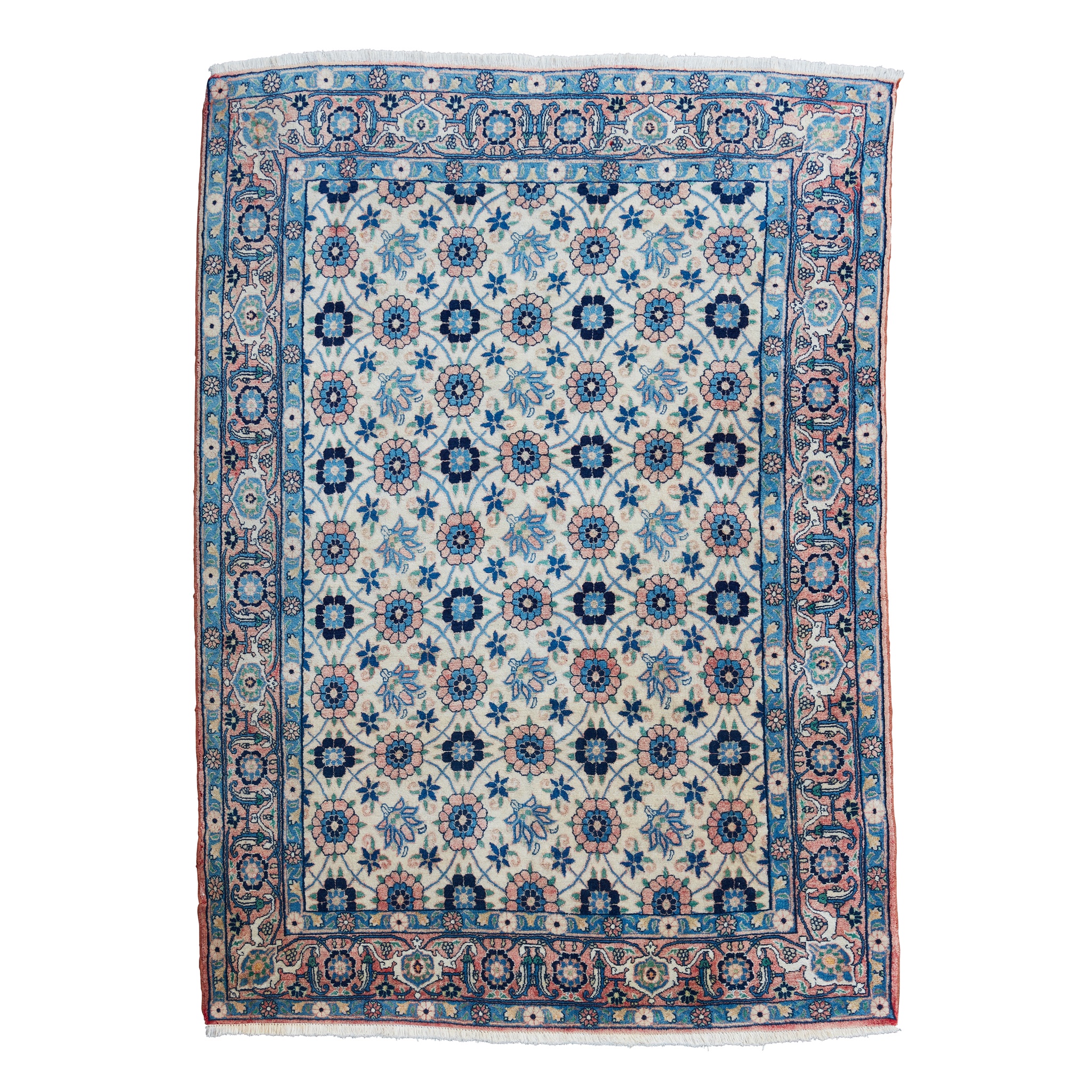 the cream field with allover rosette and vine lattice pattern, within pink turtle palmette, rosette and vine border