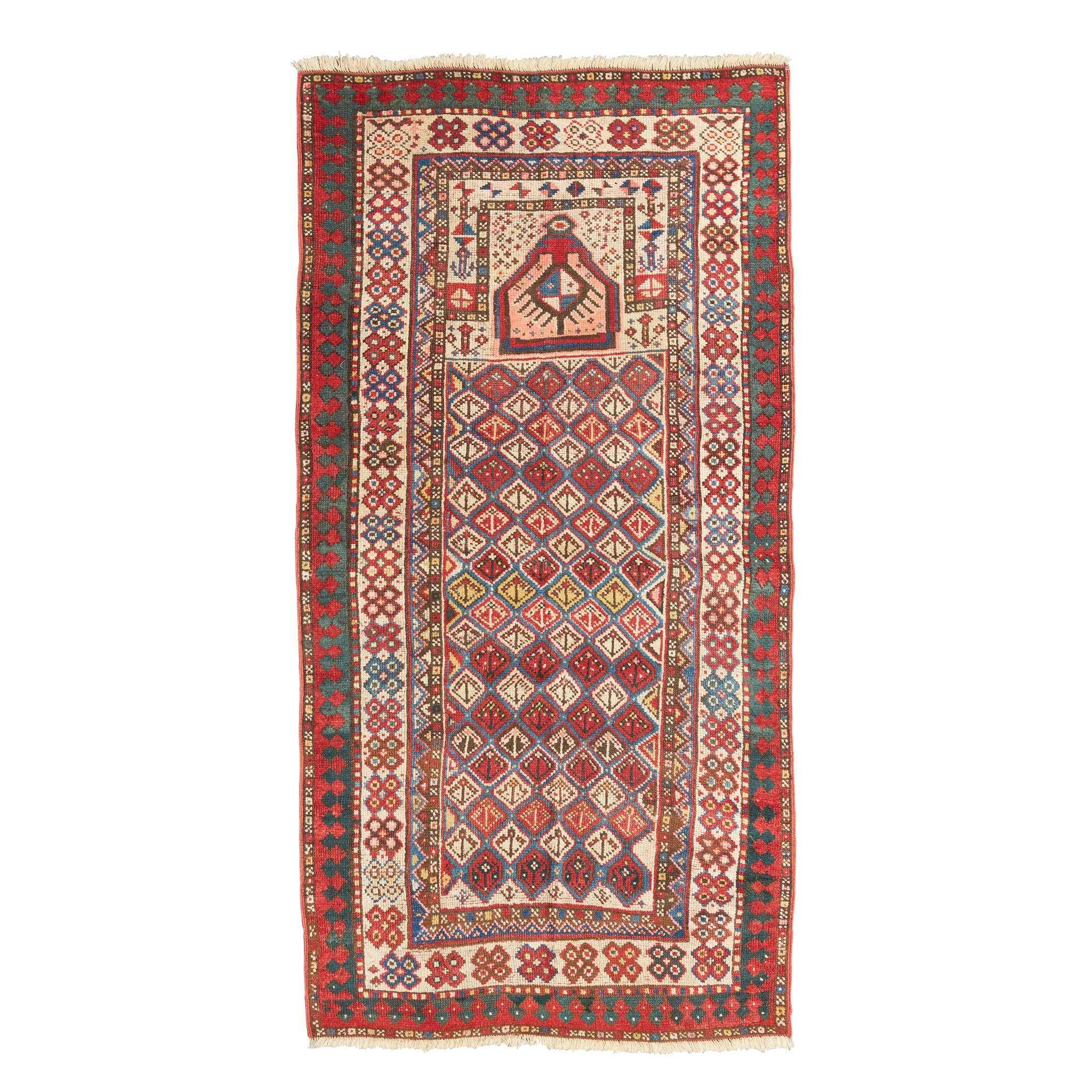 the field with allover polychrome lattice pattern, cream mihrab panel, within double cross and skittle borders