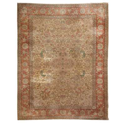 the camel field with pale pink medallion, similar spandrels, within rust brown palmette, animal and vine border