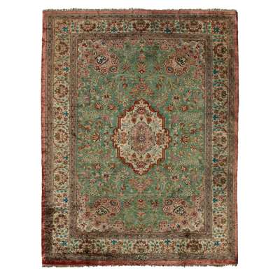 the green field with cream and pink medallion, similar spandrels, within cream floral border, signature to one end
